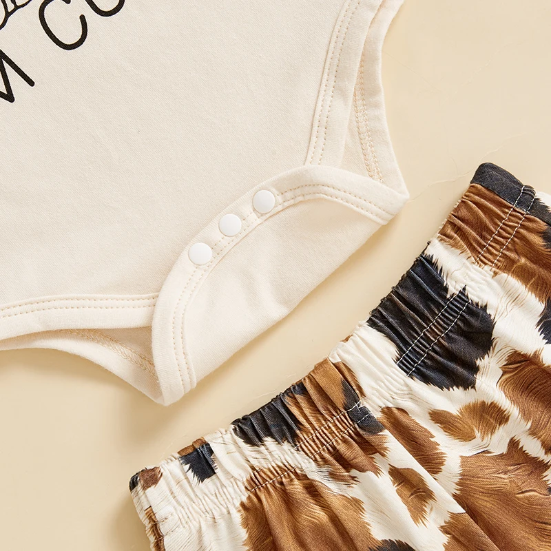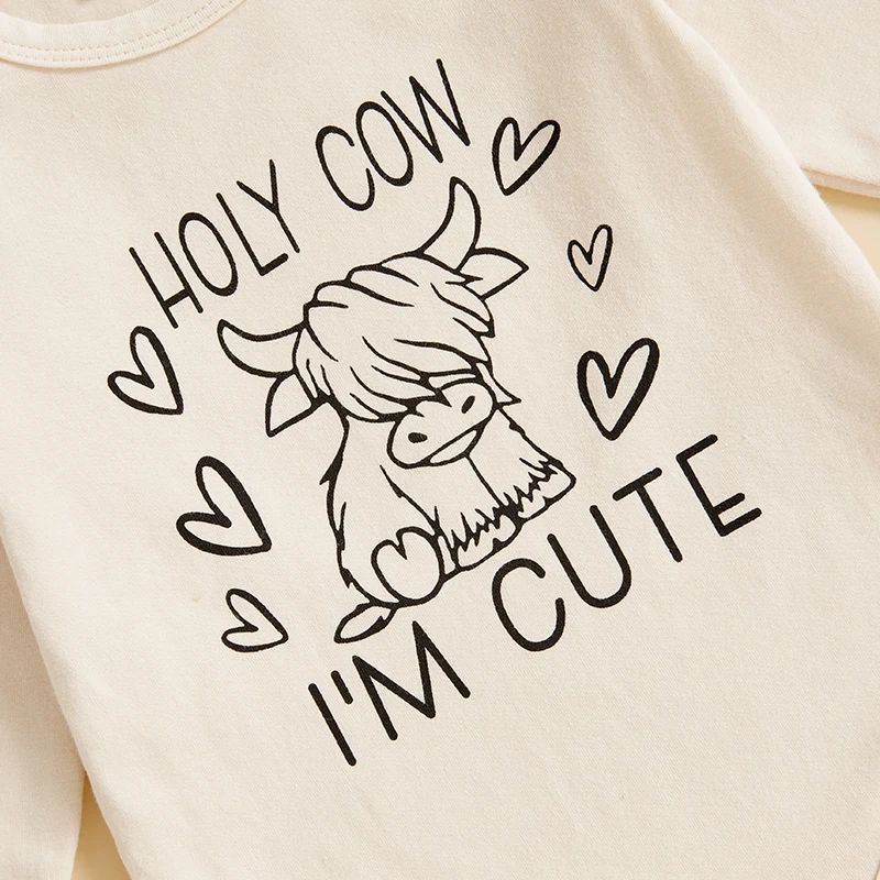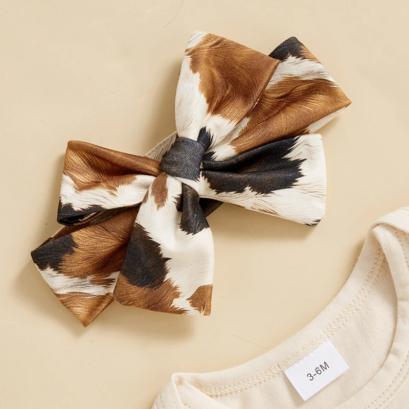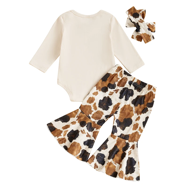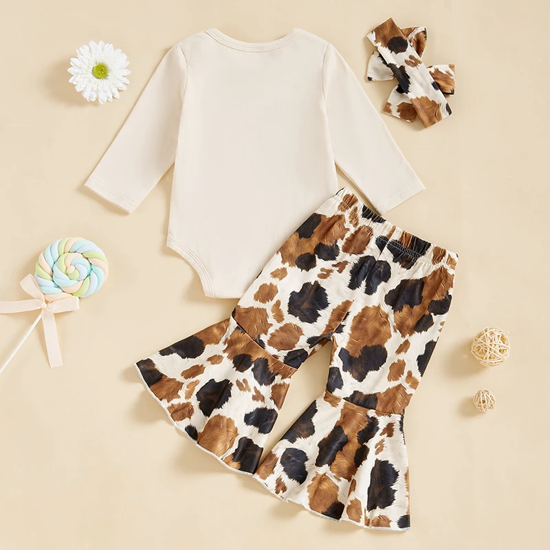 Baby Girl Fall Outfits Letter Cow Print Long Sleeve Romper Flare Pants Headband 3Pcs Clothes Set