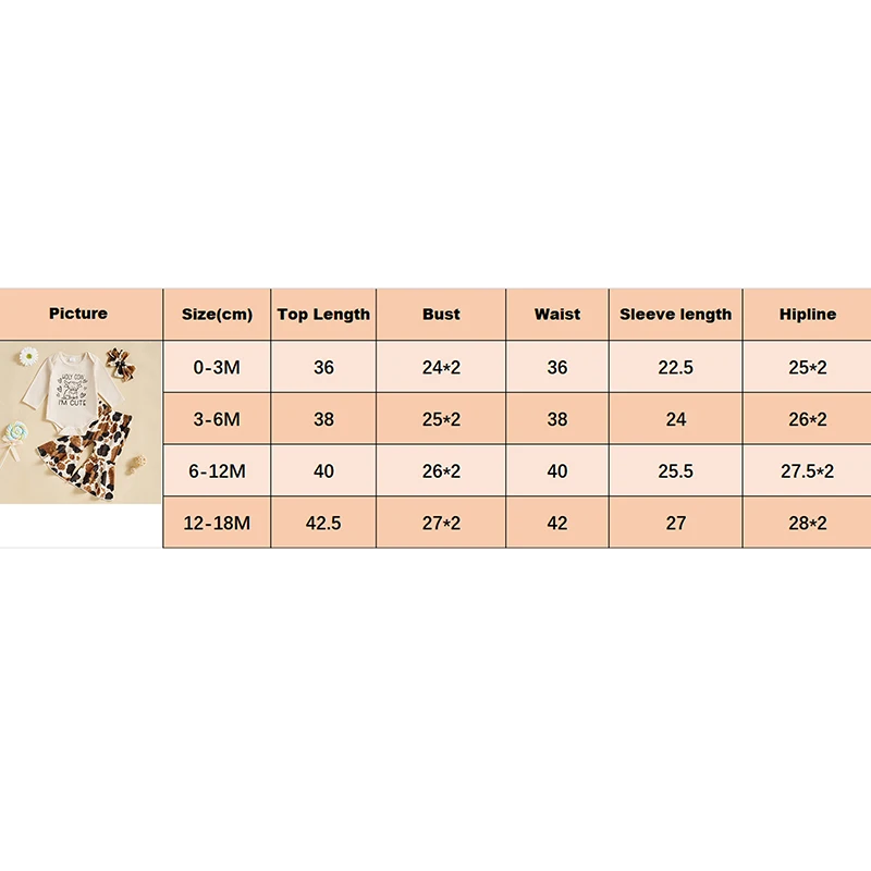 0-3M Romper Length: 36 Bust: 48 Sleeve: 22.5 Pants Length: 36 Waist: 36 Hip: 50 Advised Age: 0-3 Months