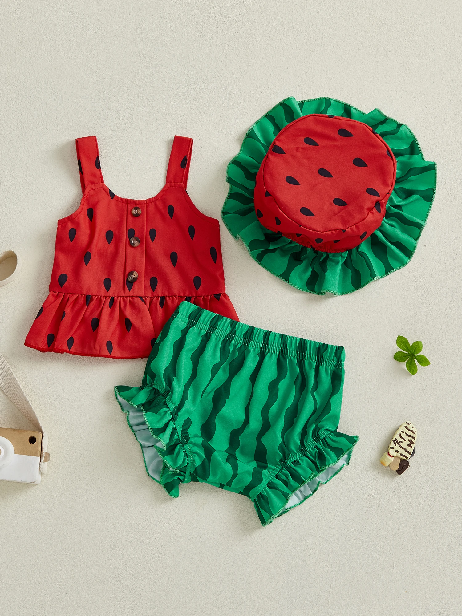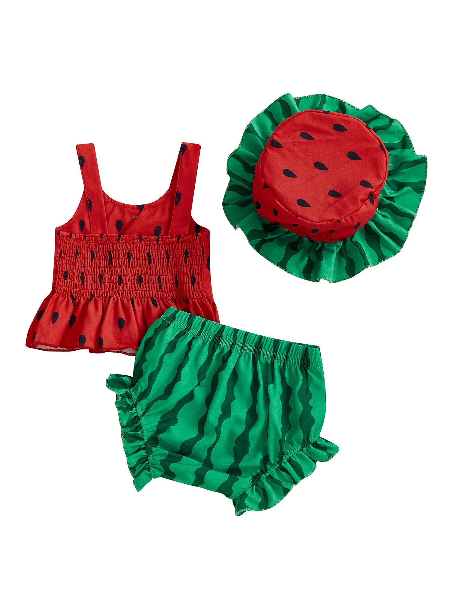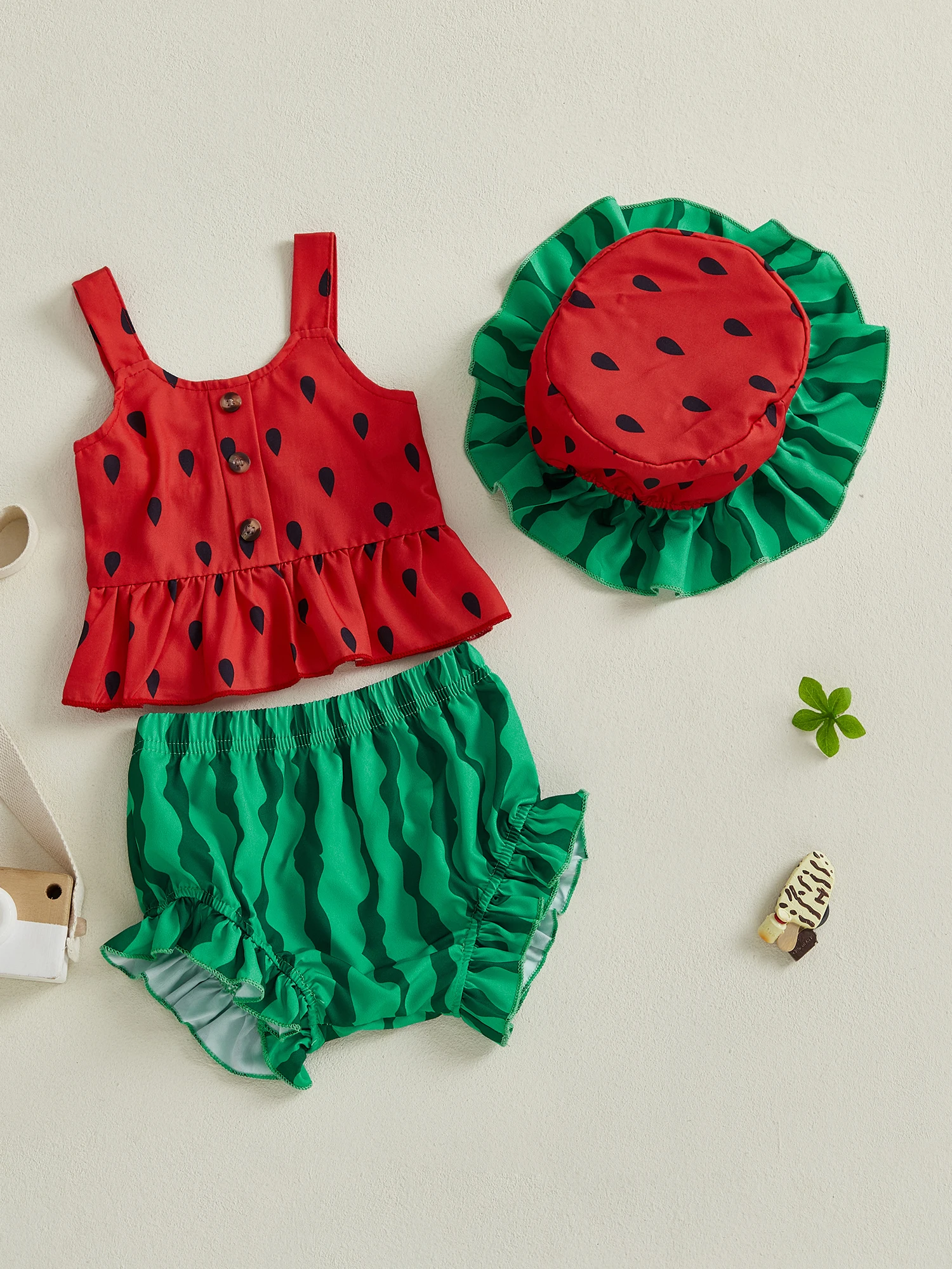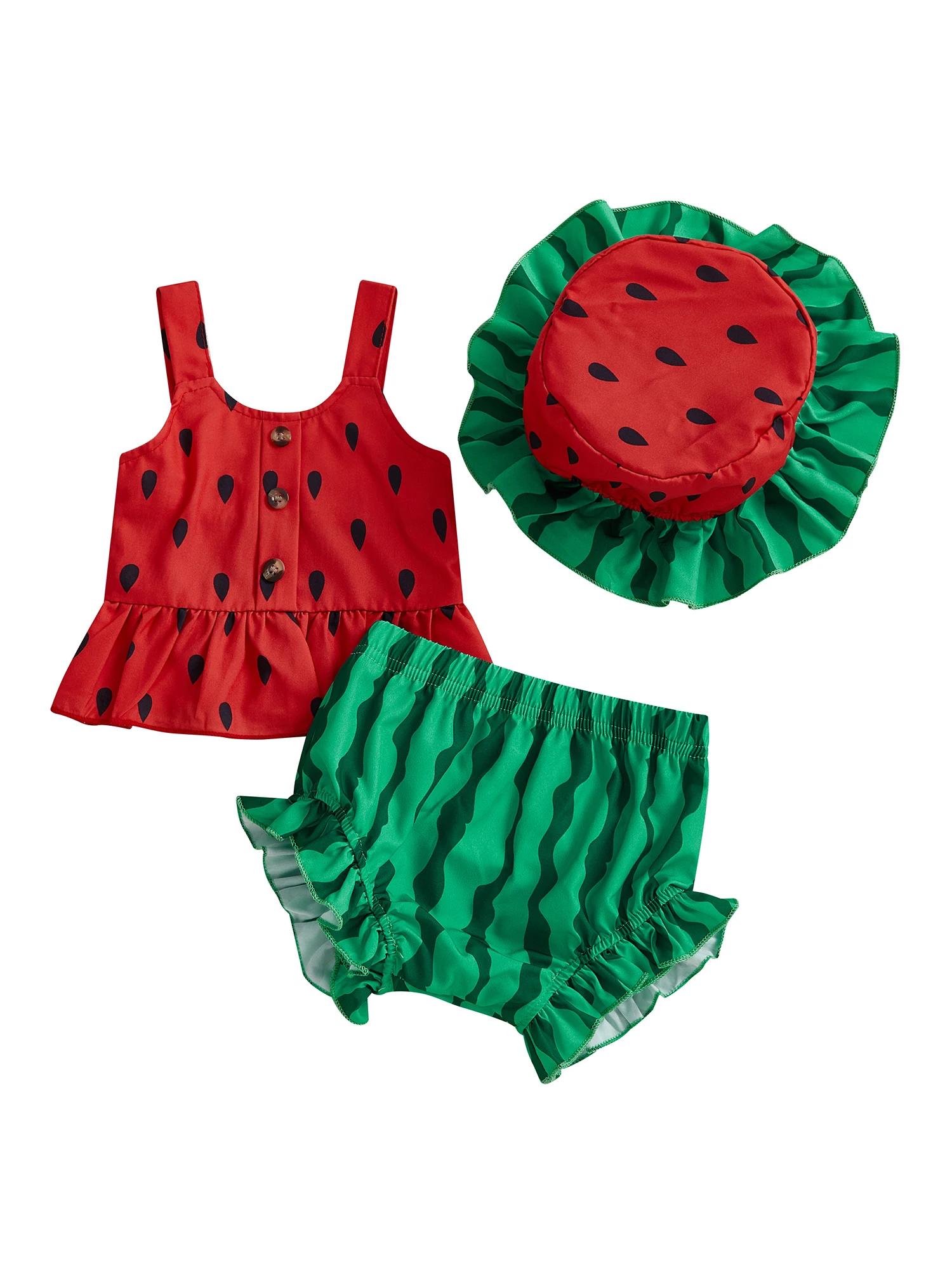 Girls 3 Piece Watermelon Outfits Sleeveless Button Cami Tops Ruffle Trim PP Shorts Hat Sets