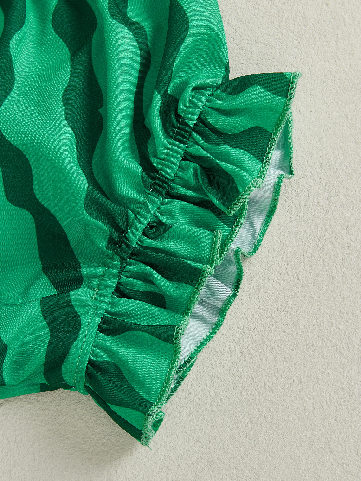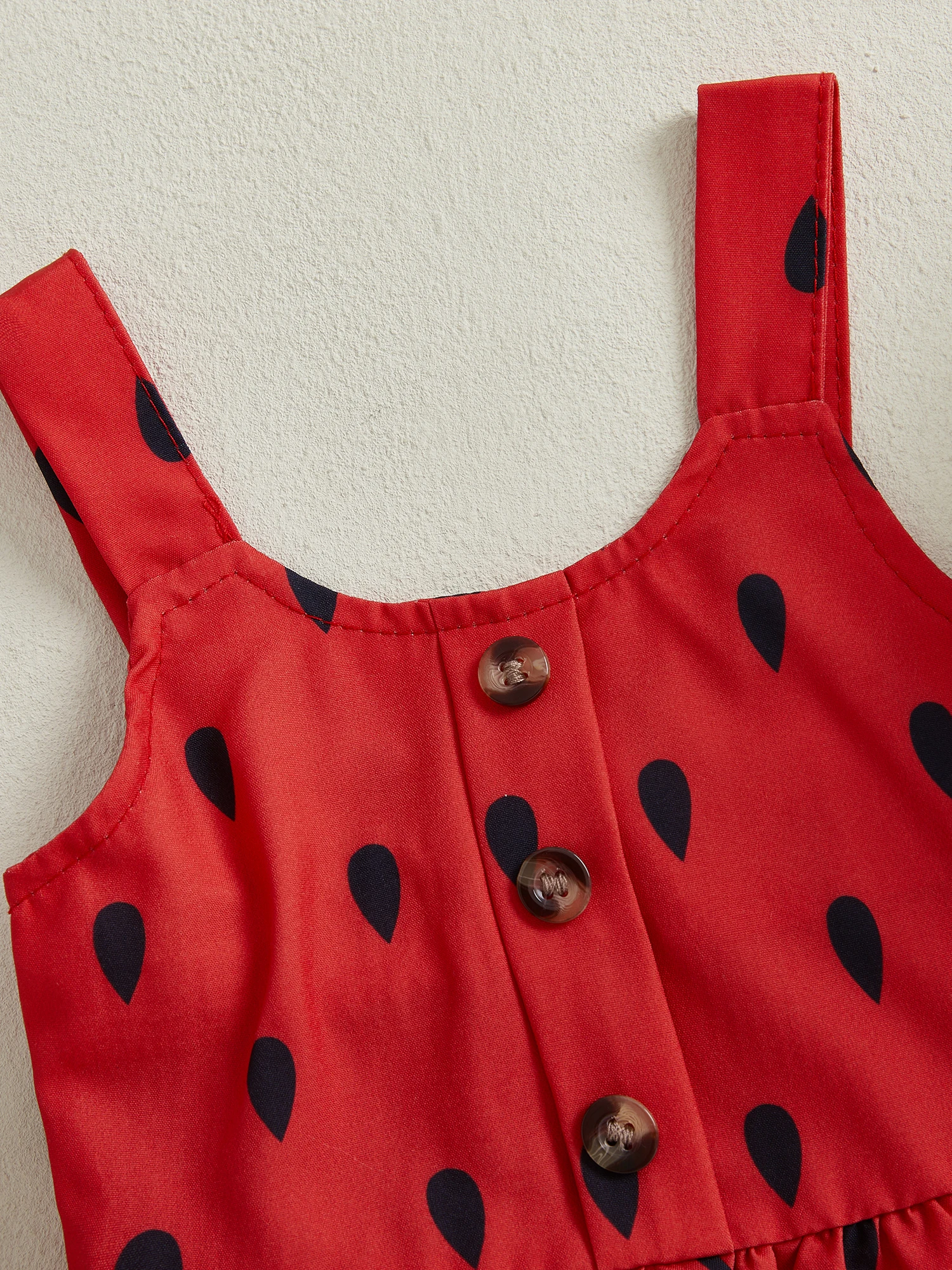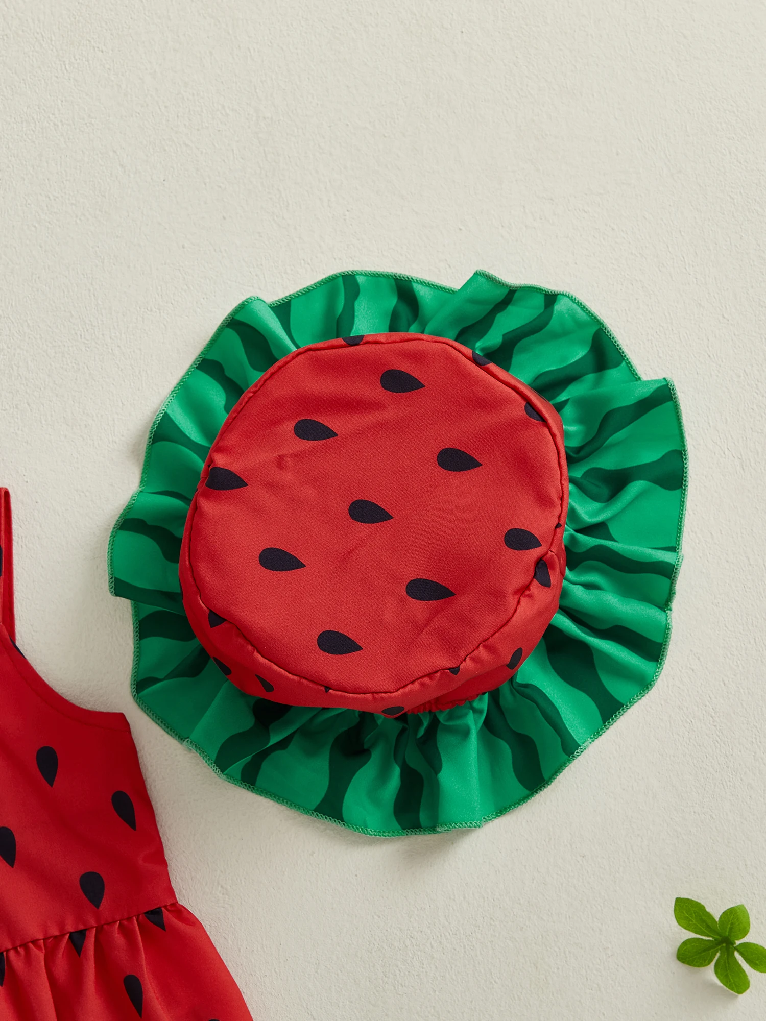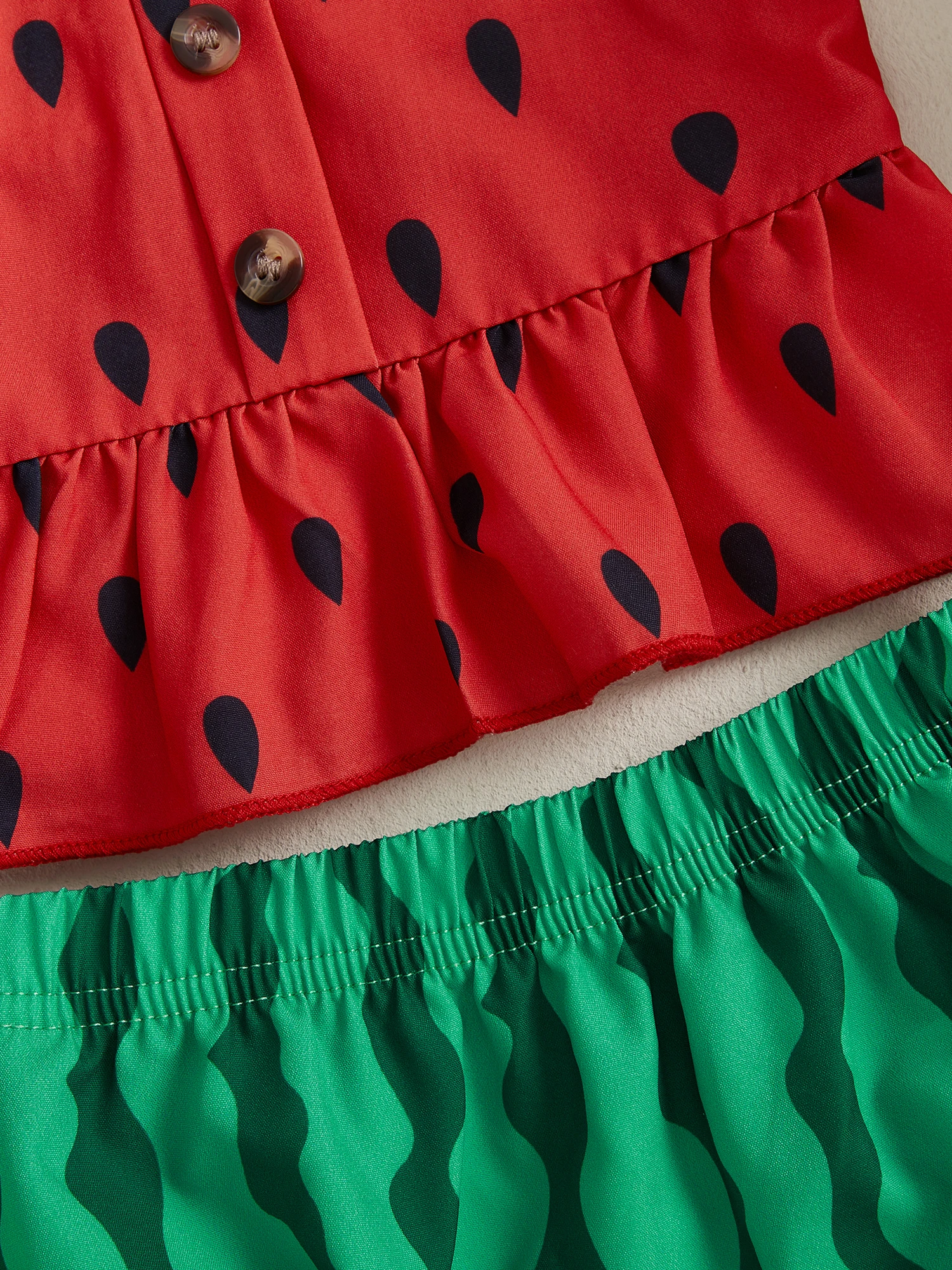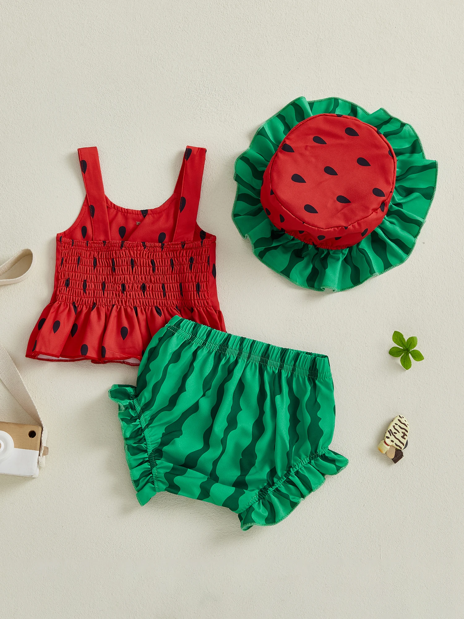 Girls 3 Piece Watermelon Outfits Sleeveless Button Cami Tops Ruffle Trim PP Shorts Hat Sets