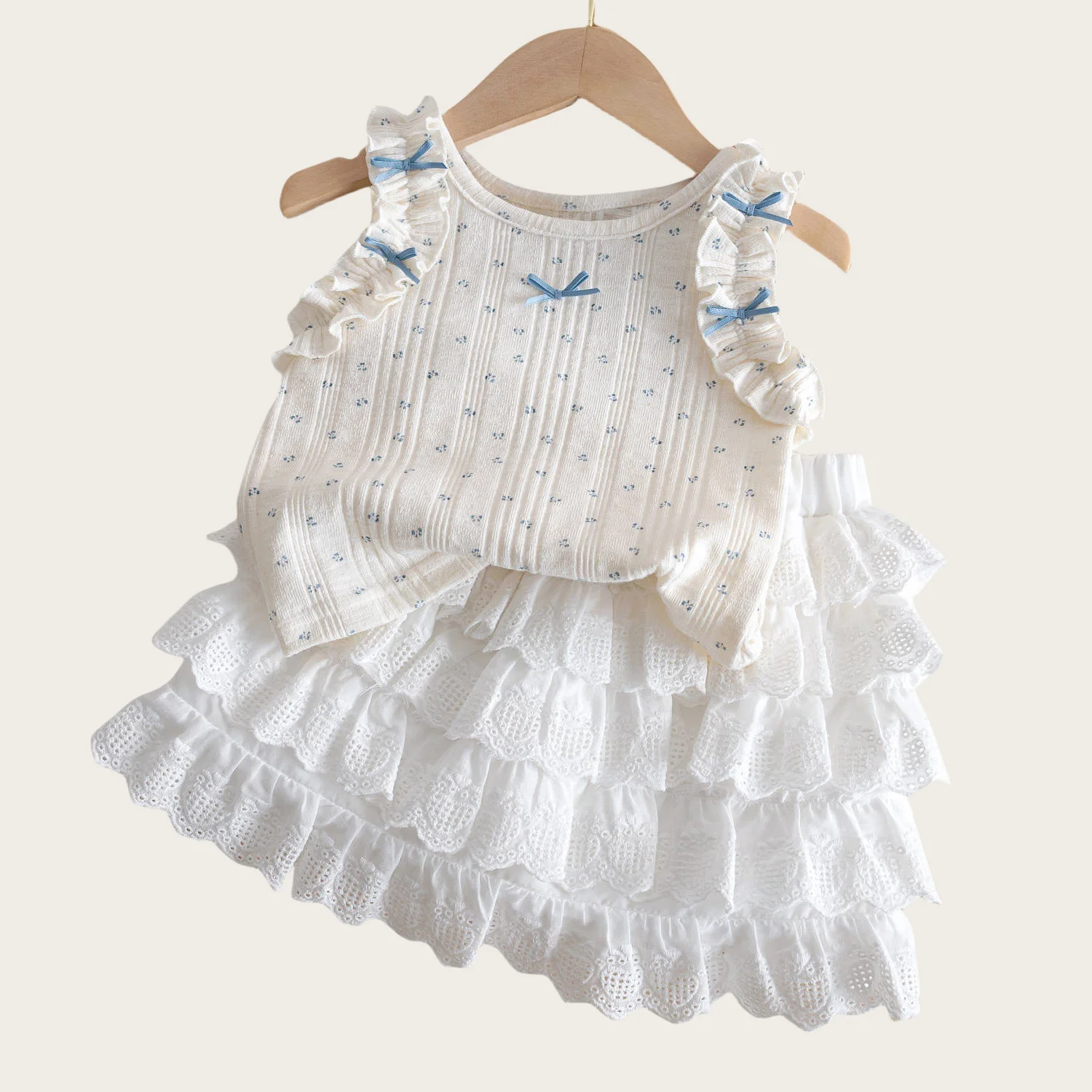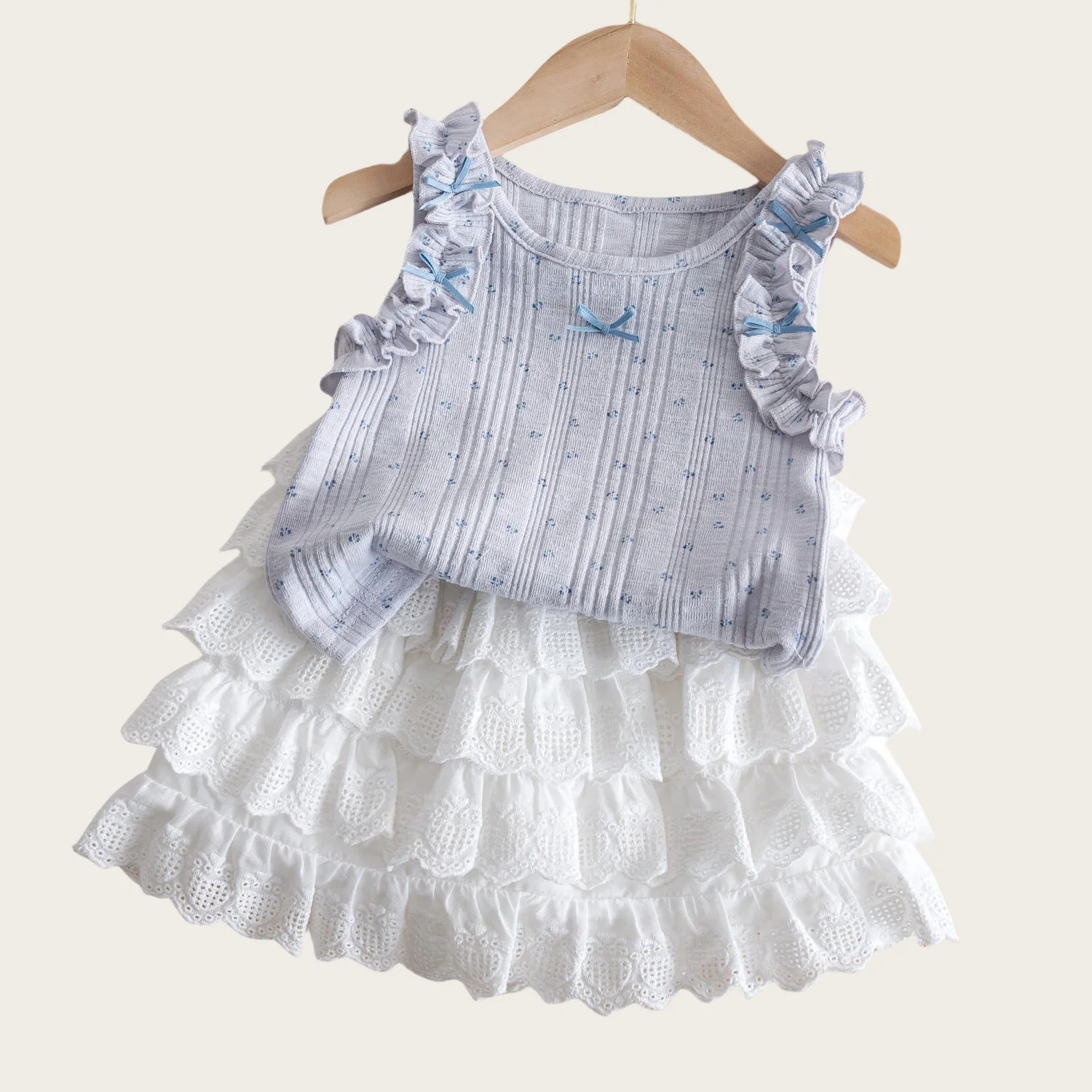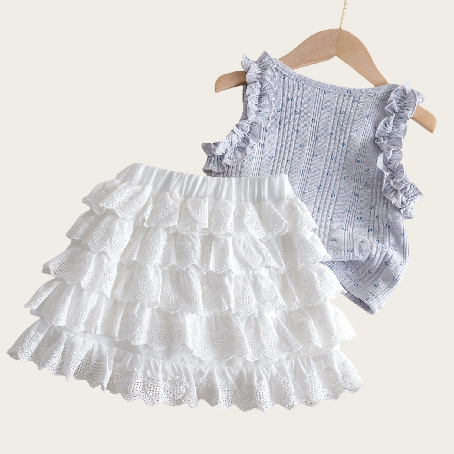 ### 2 - 6 Years Old Girls Cotton Floral Lace - Embroidered Sleeveless Top + Ruffled Cake Skirt Set