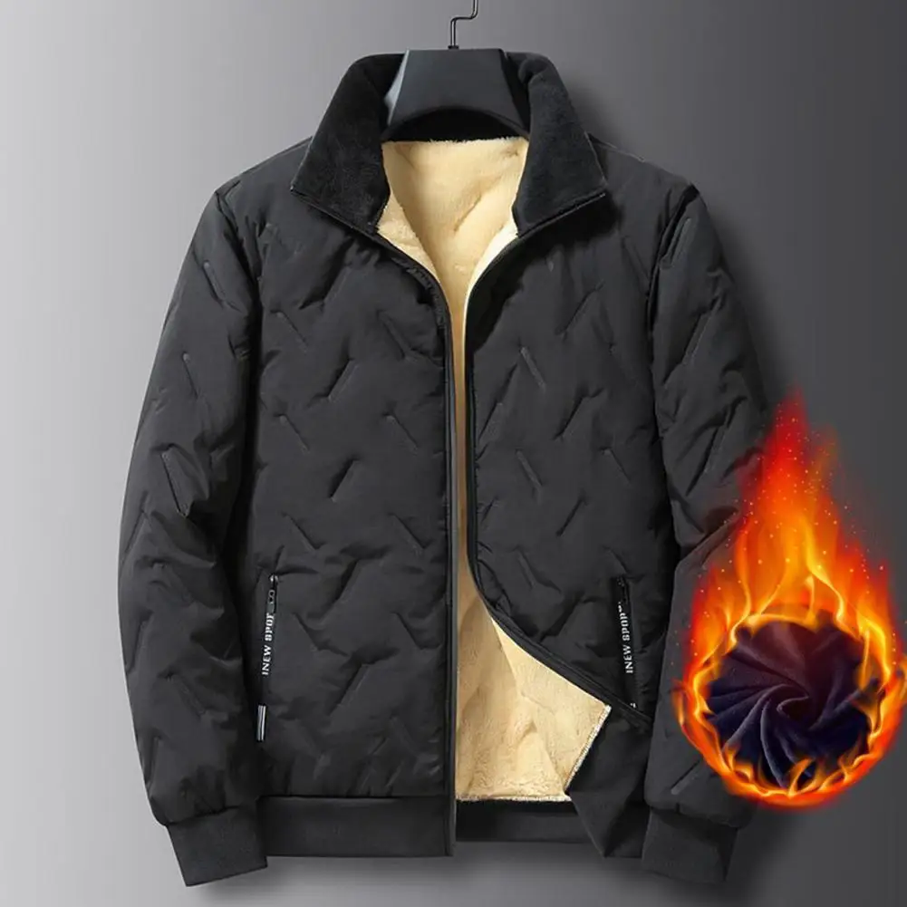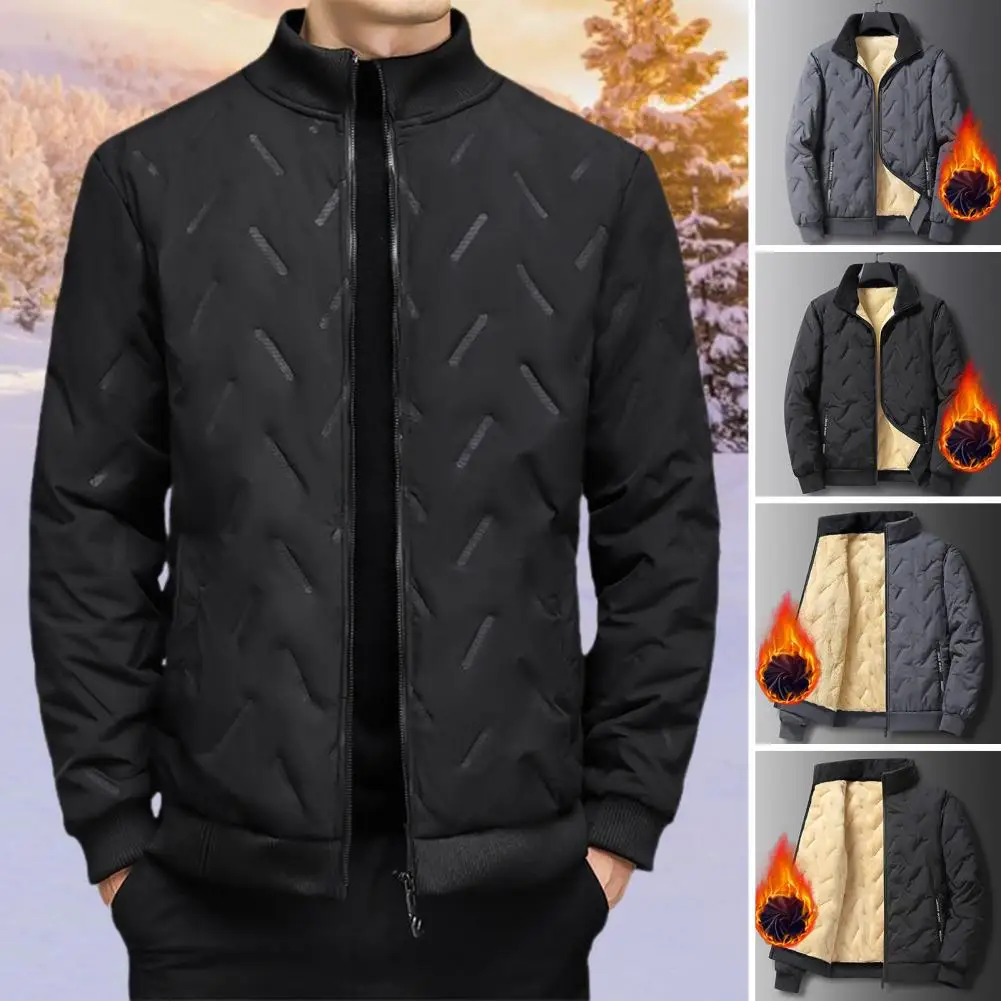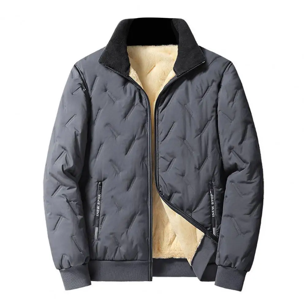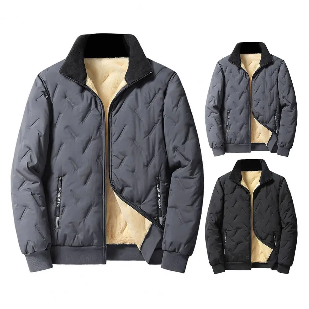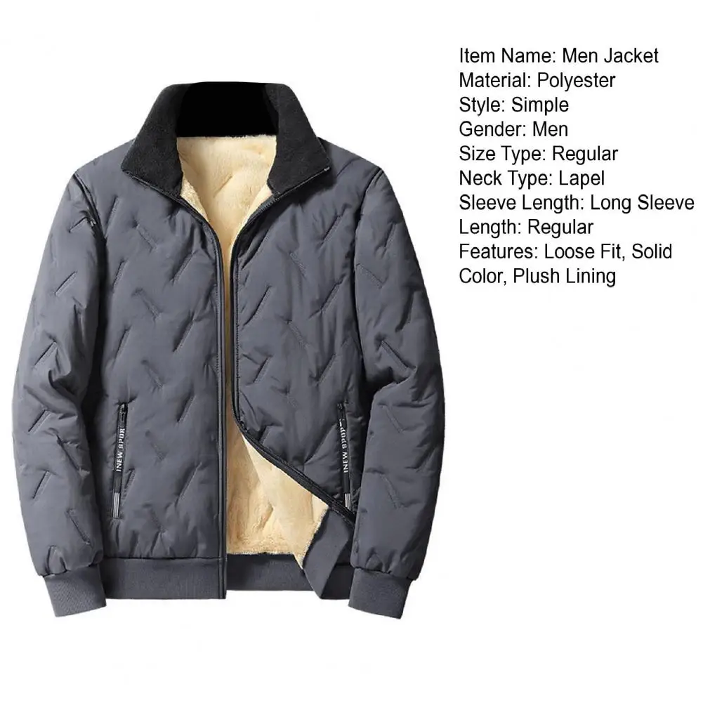 Men Jacket Lapel Long Sleeve Embossed Lines Zipper Pockets Elastic Hem Plush Lining Coat Solid Color Thickened Outwear