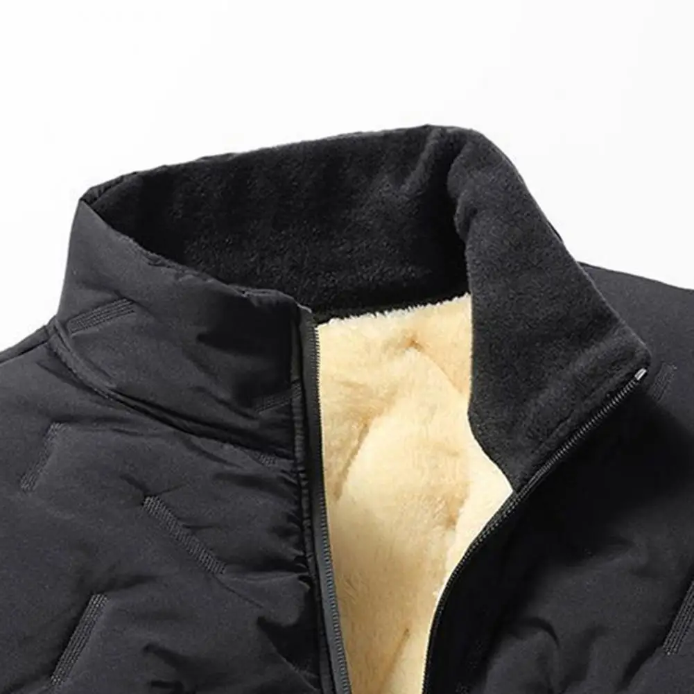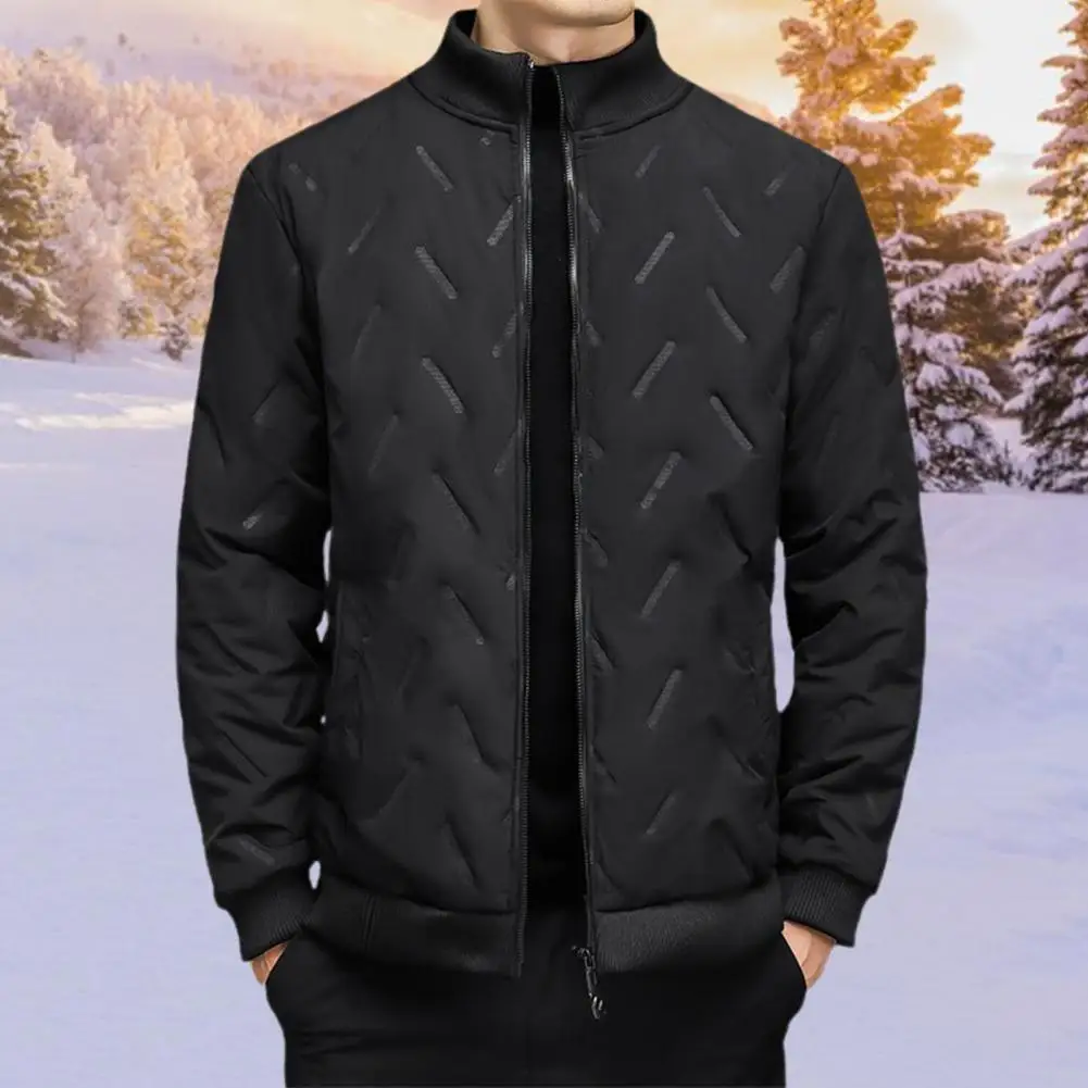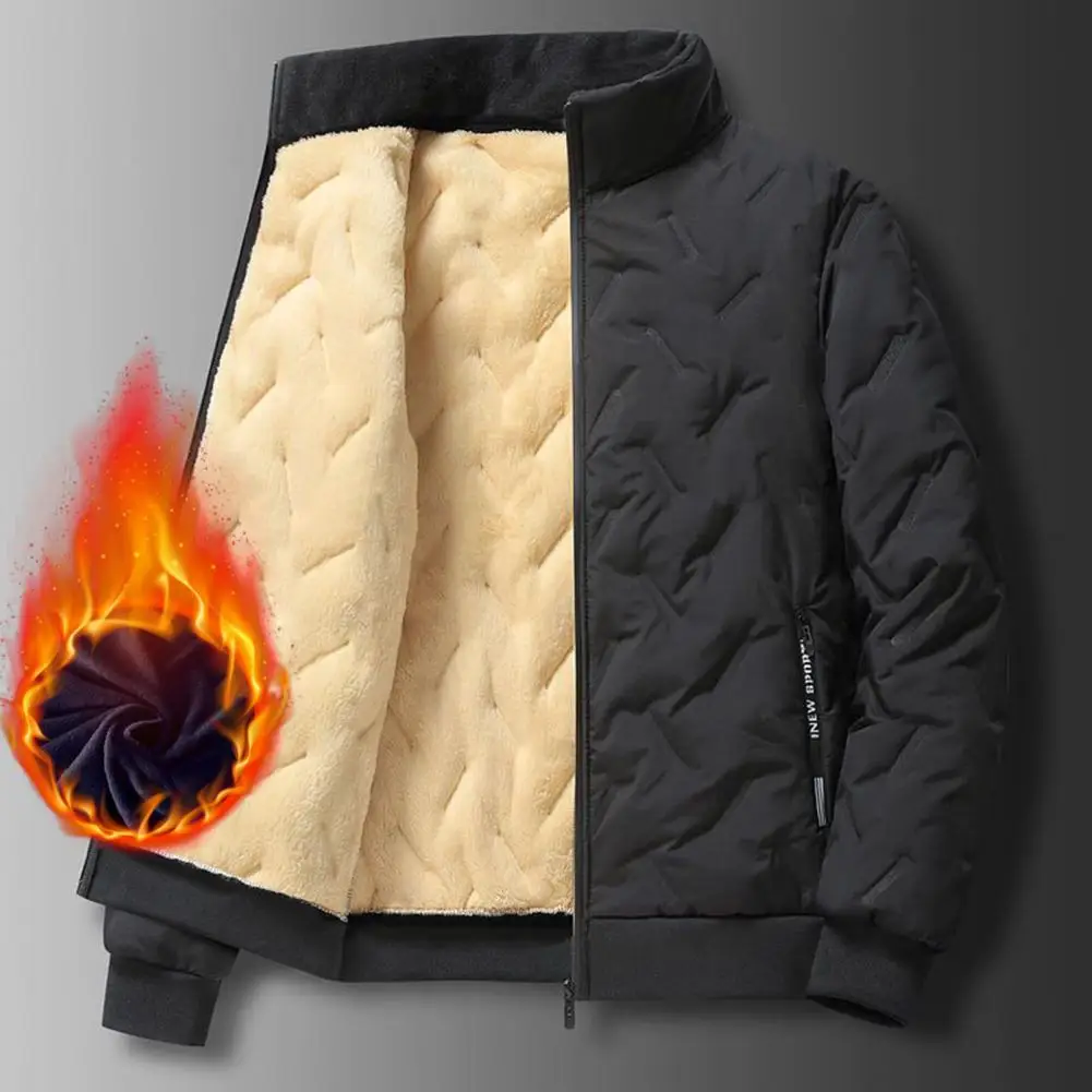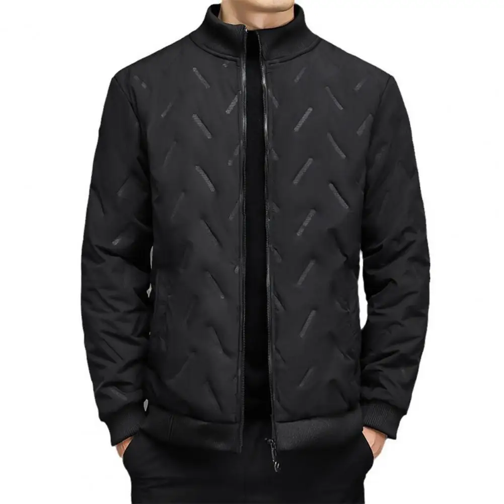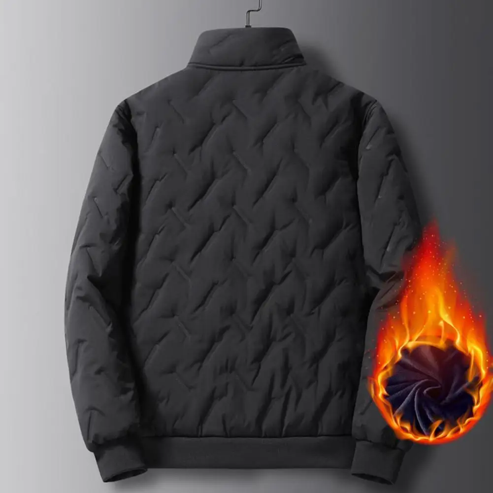 Men Jacket Lapel Long Sleeve Embossed Lines Zipper Pockets Elastic Hem Plush Lining Coat Solid Color Thickened Outwear