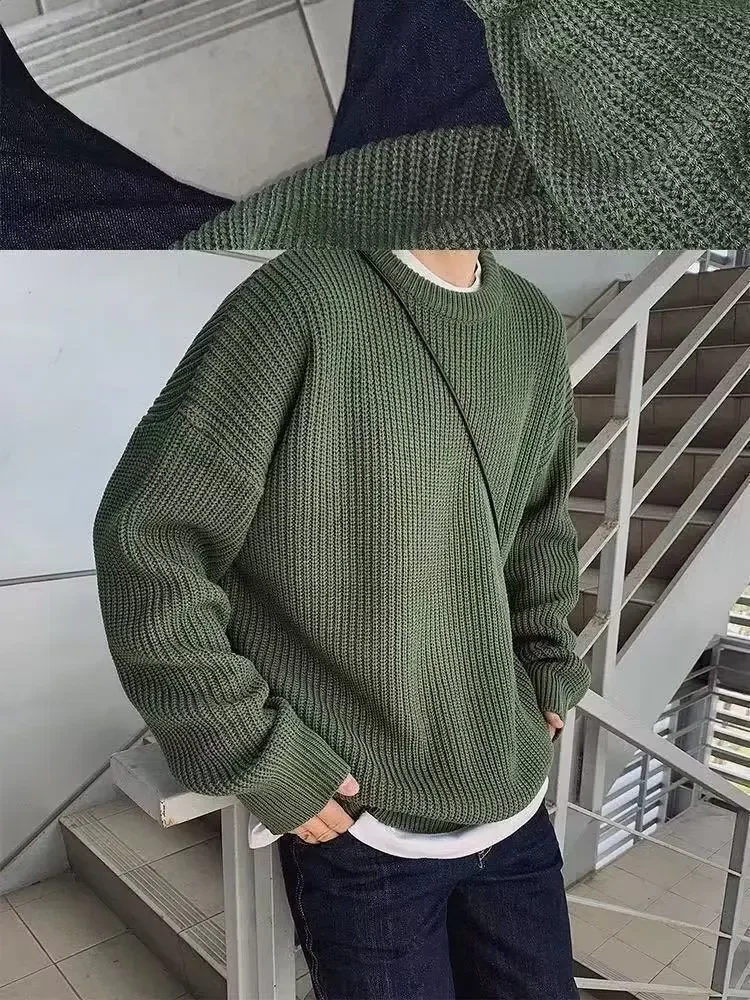 Trendy Autumn Winter Solid Color Men's Knitted Sweater Casual Loose Fit Round Neck Pullover Retro Style Cozy Comfortable